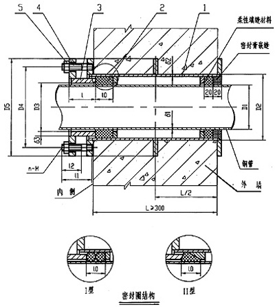 穿線密閉套管說明:1、當迎水面為腐蝕性介質時,可采用封堵材料將縫隙封堵;2.套管穿墻處如遇非混凝土墻壁時,應局部改用混凝土墻壁,其澆注范圍應比翼環直徑(DS)大200,并且必須將套管一次澆固…